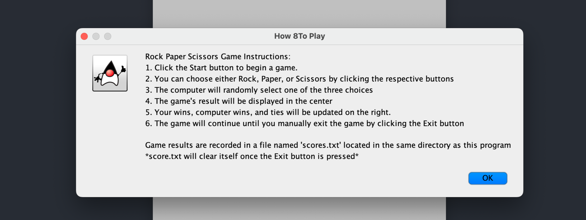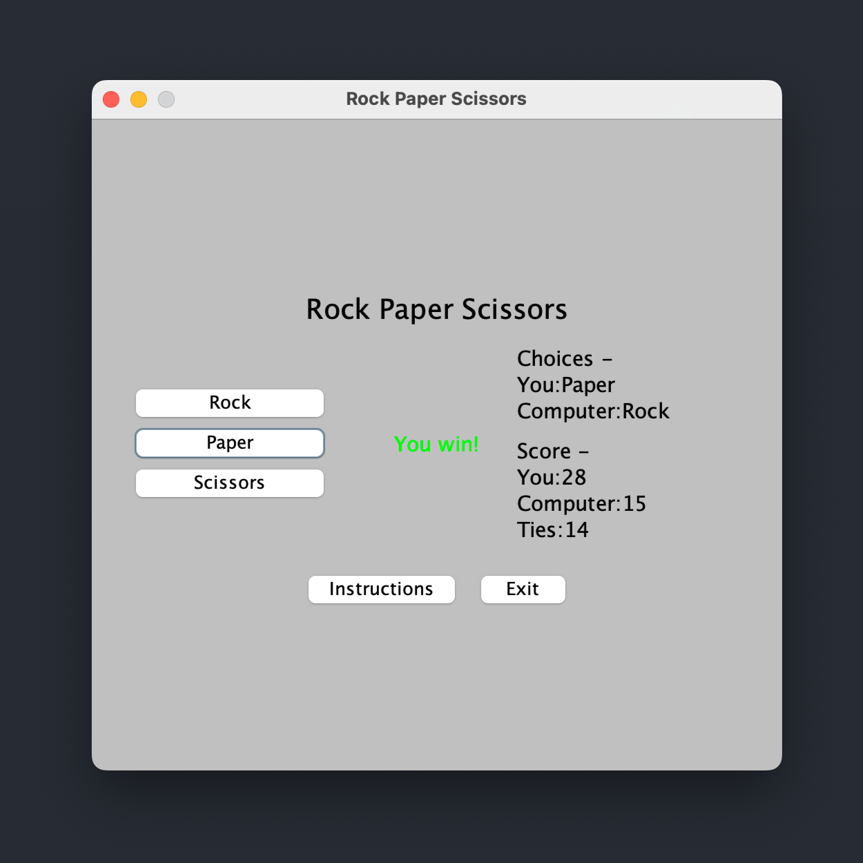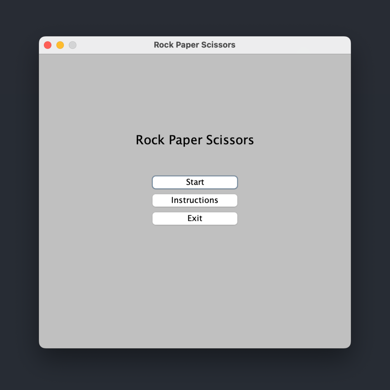 My first experience with scripting a user interface involved developing a simple Rock-Paper-Scissors game using Java and Swing. In this program, the user plays a game of Rock-Paper-Scissors against the computer and features a straightforward interface with buttons for Start, Instructions, Exit, and the three game choices—Rock, Paper, and Scissors. Additionally, the user interface has a display area showing game results and messages. This program gave me hands-on experience with creating a user-friendly interface and event-driven programming.